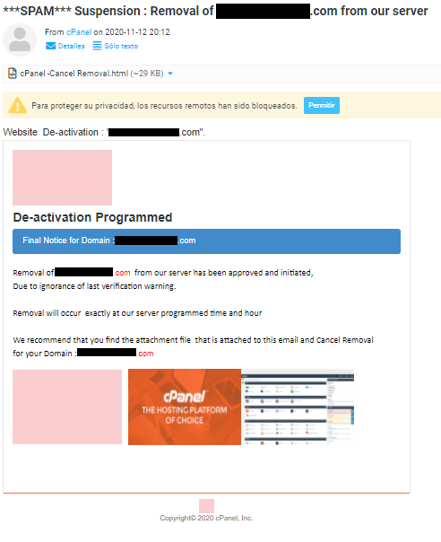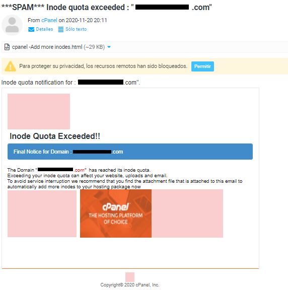 Si ha recibido o recibe algún correo electrónico indicando que excedió el limite de inodos en su cuenta de alojamiento ( Inode quota exceeded ) o Eliminación de -dominio- de nuestro servidor ( Removal of -dominio- from our server ) por favor hacer caso omiso al mensaje y eliminarlo de forma inmediata. Este tipo de correo se envían generalmente a administradores de sitios web, servidores o poseedores de algún dominio web, con el fin de obtener sus credenciales de acceso al servicio, robar su información, archivos del sitio web y correos electrónicos además de hacer un uso indebido del servicio.